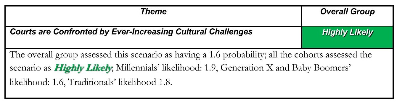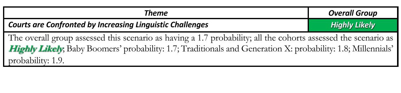 Courts face a continuing barrage of diversity challenges, both by the customers they serve and in the workforce they employ. Differences in gender, ethnicity, religious perspectives, and in opinions on work/life balance challenge all organizations, including courts. The 2017 survey included a scenario that courts will face ever-increasing cultural and linguistic challenges; it was assessed as Highly Likely with a 1.7 average probability. The 2019 survey contains separate scenarios: one on cultural challenges and one on linguistic challenges.