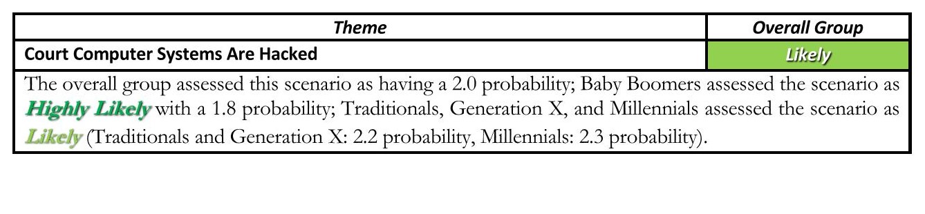 Ransomware, malware, viruses, denials of service, phishing, and eavesdropping (surreptitiously looking for website data), are all ways of hacking into computer systems including court databases. The need for computer security is growing exponentially. The scenario “Court Computer Systems are Compromised,” was first surveyed in the Summer of 2013 and assessed as Likely with a 2.2 average probability. The 2019 scenario is titled “Court Computer Systems Are Hacked.”