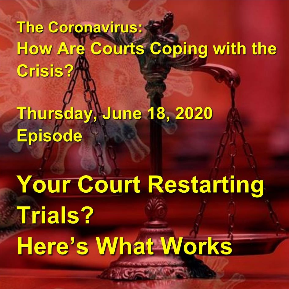 The panel discusses the experience of courts that have already held some trials; other courts that are starting pilot programs in their states; the dramatic increase in the space needs for jury trials (it is currently taking three courtrooms to hold a single trial); supplemental jury questionnaires specifically addressing jurors and the Coronavirus; masks, goggles, and gloves; disinfection routines; videos describing what courts are doing to keep jurors safe, and even the possibility of video conferencing the voir dire.
