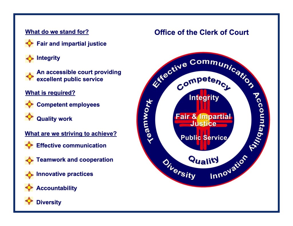Values: fair and impartial justice, integrity, public service, quality, competency, effective communication, teamwork, diversity, accountability, and innovation