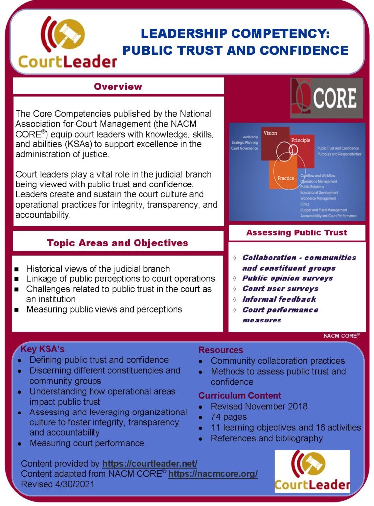 The National Association for Court Management (NACM) has included the competency of Public Trust and Confidence as a significant area of knowledge, skills, and abilities for court leaders to master. The full CORE© competency on Public Trust and Confidence may be viewed and studied at https://nacmcore.org/competency/public-trust-and-confidence/.