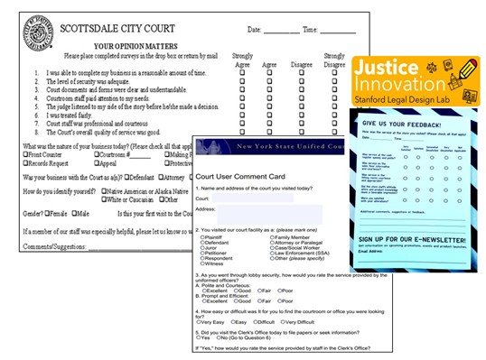 From Scottsdale City Court (on site comment card, hard copy), New York Courts – https://www.nycourts.gov/IP/qualityservice/QualityServiceComments.pdf, and the Justice Innovation Lab at Stanford – https://justiceinnovation.law.stanford.edu/court-feedback-cards/.