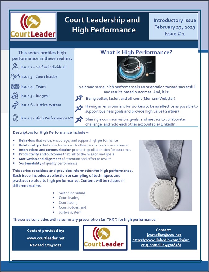 This issue commences a series of postings on high performance. Effective and efficient performance contributes to quality outcomes and results. Postings in this series will consider techniques and practices related to high performance – for: the self or individual, the court leader, the team (in the court environment), the judges, and the justice system. The series will conclude with a prescription for high performance, one which draws from content in each individual posting.