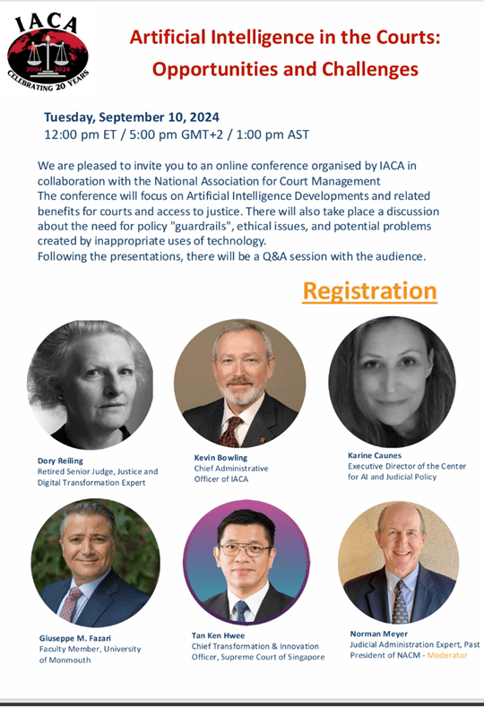 Artificial Intelligence (AI) continues to be one of the hottest topics in court administration. It seems like every day there is a new development! To help us stay abreast of what is going on, the International Association for Court Administration (IACA) is presenting a webinar on September 10: “Artificial Intelligence in the Courts – Opportunities and Challenges.” The panel of experts will update us on what is happening around the world, including many examples of how AI is already being used in the courts. I am honored to be the webinar moderator. To register, go to the IACA website at Home (iaca.ws). The webinar will be recorded and posted to the IACA website in case you cannot attend the live presentation. Interested? Here is the IACA flyer about the session and faculty: