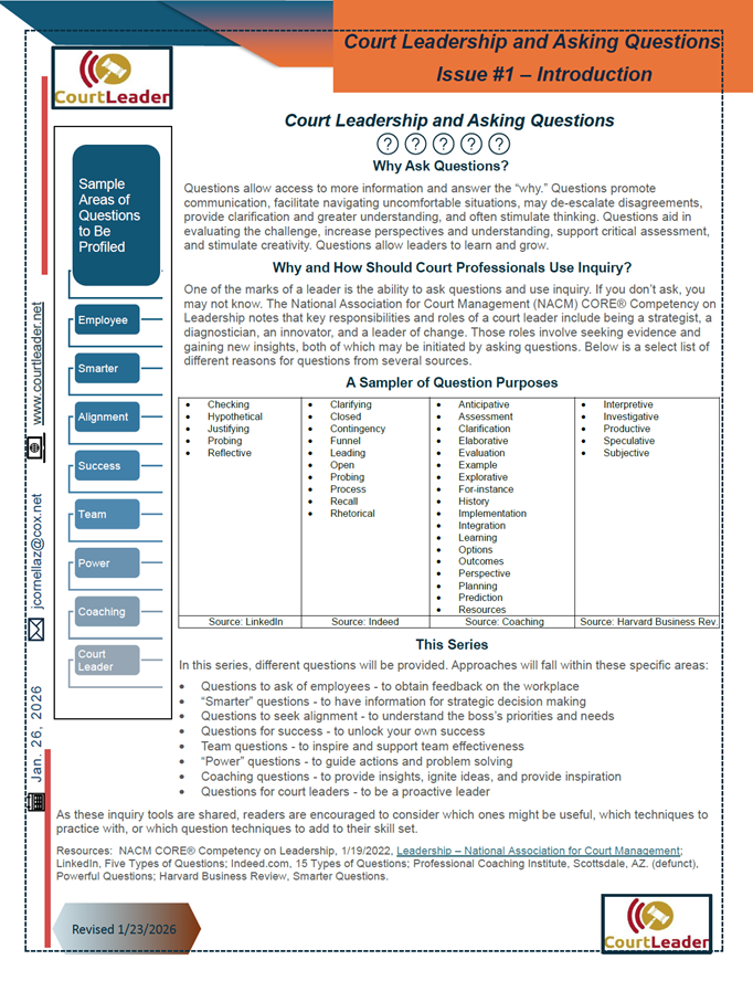 Welcome to this new series on asking questions as a court leader. This series is a reflection of my strong interest in asking questions. Earlier in my court career, co-workers commented (and truly teased me) that I asked lots of questions. During court employment assignments, I was frequently called upon to calm a crisis, turn around a troubled operational area, or bring insights to make the operation better – and when doing so, I asked many questions, often during interviews and meetings, with both judges and court staff. I also developed a habit of doing what I’ll call “self-questions” when I had concerns about my own performance or my career progress. These were often noted in a journal or shared with a trusted colleague.