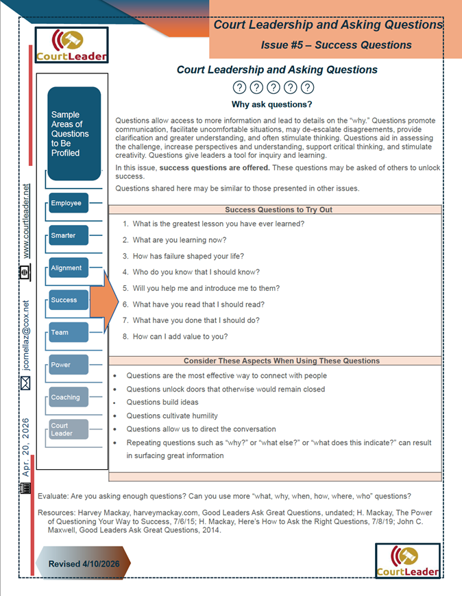 Here is Issue #5, in which “success questions” are noted. These different questions are useful to ask of others and to obtain helpful information and insights that may increase success. These questions might also provide some interesting details to consider.
